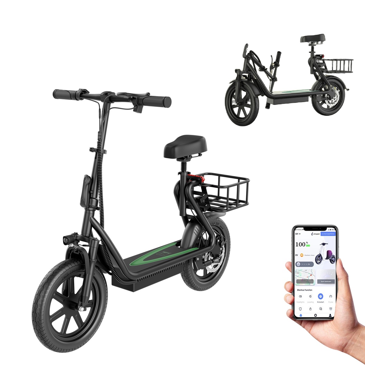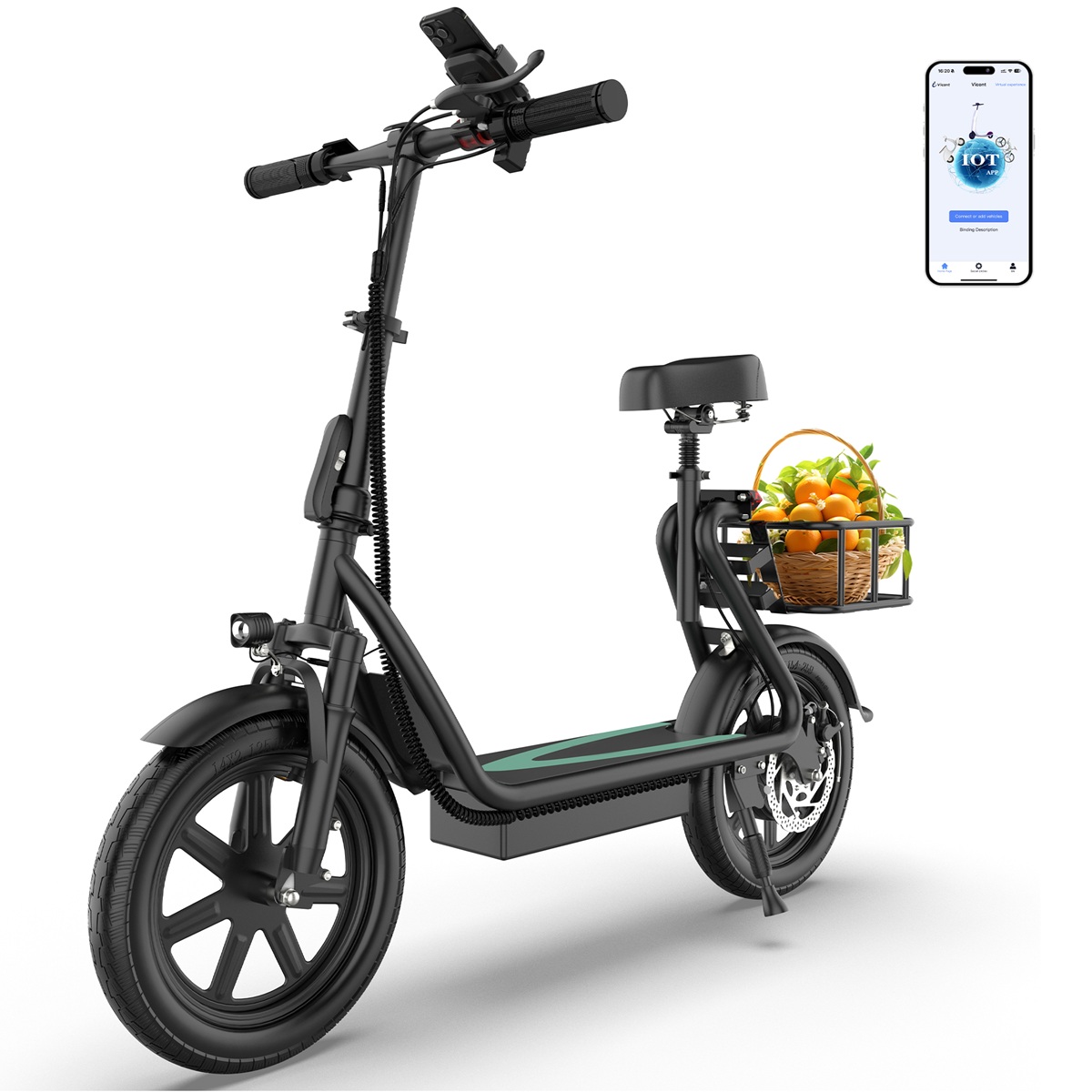 összecsukható elektromos roller, ülés, kosár, irányjelzők, felfüggesztés, 500 W teljesítmény, akár 43 km hatótáv, legnagyobb sebesség 25 km/h, teherbírás 120 kg, mobilalkalmazás